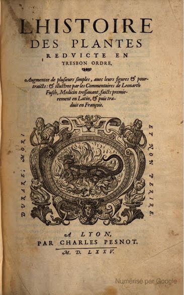 Fuchs Leonhart● L’histoire des plantes● Lyon : Charles Pesnot● 1575● L’HISTOIRE || DES PLANTES || REDVICTE EN || TRESBON ORDRE, || Augmentee de plusieurs simples, auec leurs figures & pour- || traicts : & illustree par les Commentaires de Leonarth || Fusch, Medicin tressauant, faicts premi- || rement en Latin, & puis tra- || duit en François. || [Device] || A LYON, || PAR CHARLES PESNOT. || [-] || M. D. LXXV. USTC ● USTC : 30107 . 2 langues : Français ♢ Latin ♢