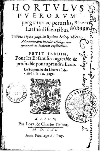 Fontaine Jean● Hortulus puerorum pergratus ac perutilis Latine discentibus adjecimus duos in calce dialogos cum quorundam ludorum explicatione● Lyon : Charles Pesnot, Louis Pesnot● 1561● USTC : 113278 . 2 langues : Français ♢ Latin ♢