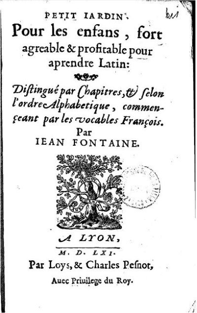 Fontaine Jean● Petit jardin pour les enfans, fort aggreable et profitable pour aprendre latin● Lyon : Charles Pesnot, Louis Pesnot● 1561● PETIT IARDIN || Pour les enfans, fort || agreable & profitable pour || aprendre Latin : || [fleuron] || Distingué par Chapitres, et selon || l’ordre Alphabetique, commen- || çeant par les vocables François. || Par || IEAN FONTAINE. || [Device] || A LYON, || M. D. LXI. || Par Loys, & Charles Pesnot, || Auec Priuilege du Roy. USTC ● USTC : 24423 . 2 langues : Français ♢ Latin ♢