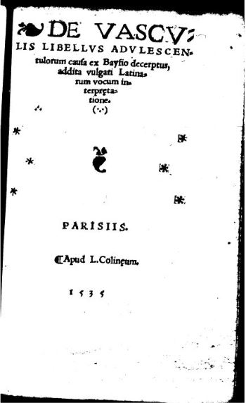 Baïf Lazare (de)● De vasculis libellus● Paris : Robert I Estienne● 26 juillet 1535● De vasculis li- || BELLVS, ADVLESCEN- || tulorum causa ex Bayfio decer- || ptus, addita vulgari Latinarum || vocum interpretatione. || [Device] || PARISIIS. || Ex officina Rob. Stephani. || M. D. XXXV. USTC ● BP16 : BP16_107748 . USTC : 79710 . 2 langues : Français ♢ Latin ♢