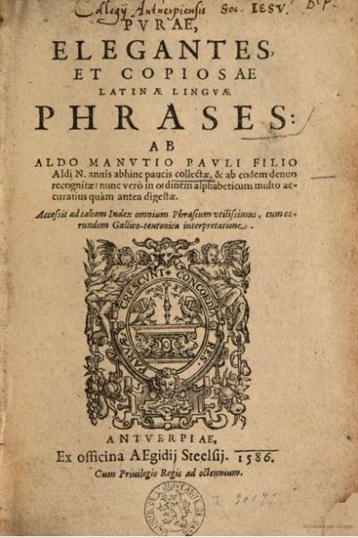 Manuzio Aldo● Purae, elegantes et copiosae Latinae linguae phrases, collectae recognitae. Accessit ad calcem index cum earumdem Gallico-Teutonica interpretatione● Anvers : Gillis Stelsius : Gillis van den Rade● 1586● USTC : 413670 . 3 langues : Français ♢ Latin ♢ Néerlandais ♢