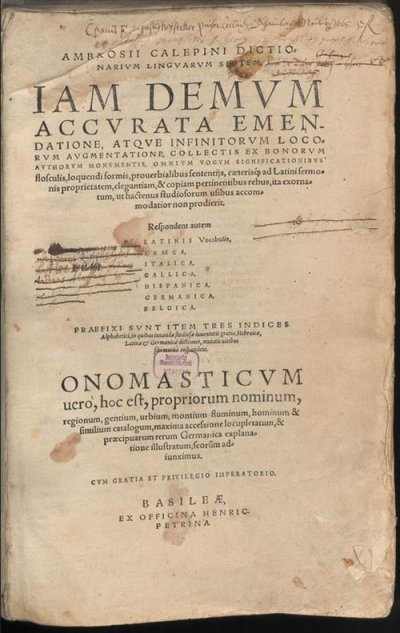Calepino Ambrogio● Dictionarium linguarum septem, jam demum accurata emendatione, atque infinitorum locorum augmentatione. Respondent autem Latinis vocabulis, Graeca, Italica, Gallica, Hispanica, Germanica, Belgica● Bâle : Sebastián Henricpetri● (1574)● AMBROSII CALEPINI DICTIO= || NARIVM LINGVARVM SEPTEM, || IAM DEMVM || ACCVRATA EMEN= || DATIONE, ATQVE INFINITORVM LOCO= || RVM AVGMENTIONE, COLLECTIS EX BONORVM || ATHORVM MONVMENTIS, OMNIVM VOCVM SIGNIFICATIONIBVS, || flosculis, loquendi formis, prouerbialibus sententijs, caeteris’qz ad Latini sermo= || nis proprietatem, elegantiam, & copiam pertinentibus rebus, ita exorna= || tum, ut hactenus studiosorum usibus accom= || modatior non prodierit. || Respondent autem, || LATINIS Vocabulis, || GRAECA, || ITALICA, || GALLICA, || HISPANICA, || GERMANICA, || BELGICA, || PRAEFIXI SVNT ITEM TRES INDICES || Alphabetici, in quibus iuuandae studiosae iuuentutis gratia, Hebraicae, || Latinae & Germanicae dictiones, mutatis uicibus || sibi mutuò respondent. || ONOMASTICVM || uerò, hoc est, propriorum nominum, || regionum, gentium, urbinum, montium, fluminum, hominum & || similium catalogum, maxima accessione locupletatum, & || praecipuarum rerum Germanica explana= || tione illustratum, seorsim ad= || iunximus. || CVM GRATIA ET PRIVILEGIO IMPERATORIO. || BASILEAE, || EX OFFICINA HENRIC- || PETRINA. USTC ● USTC : 442411 , 61656 , 611111 . Claes, 1974 : n°244 . Labarre, 1975 : n°124. Bingen, 1987 : p.43 et 45, n°12a. Lindemann, 1994 : p.549, «Ambrosius CALEPINUS». Niederehe, 1995 : n°555.