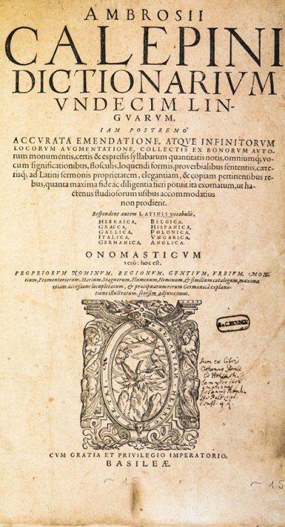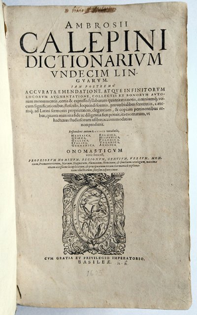 Calepino Ambrogio● Dictionarium undecim linguarum [...] respondent autem Latinis vocabulis, Hebraica, Graeca, Gallica, Italica, Germanica, Belgica, Hispanica, Polonica, Ungarica, Anglica● Bâle : Sebastian Henricpetri● (1605)● 1 ou 2 vol. in-folio● AMBROSII || CALEPINI || DICTIONARIVM || VNDECIM LIN- || GVARVM, || IAM POSTREMÒ’ || ACCVRATA EMENDATIONE, ... || [4 lignes] || ... ita exornatum, vt ha- || ctenus studiosorum usibus accommodatius || non prodierit. || [6 lignes] || ONOMASTICVM || verò : hoc est, || [4 lignes en italique. Marque] || CVM GRATIA ET PRIVILEGIO IMPERATORIO. || BASILEAE. || Labarre75 ● USTC : 2000963 , 2066162 . Beaulieux, 1904 : p.377 , «Calepinus (Ambrosius) ». Labarre, 1975 : n°168. Bingen, 1987 : p.43 et 48, n°52.